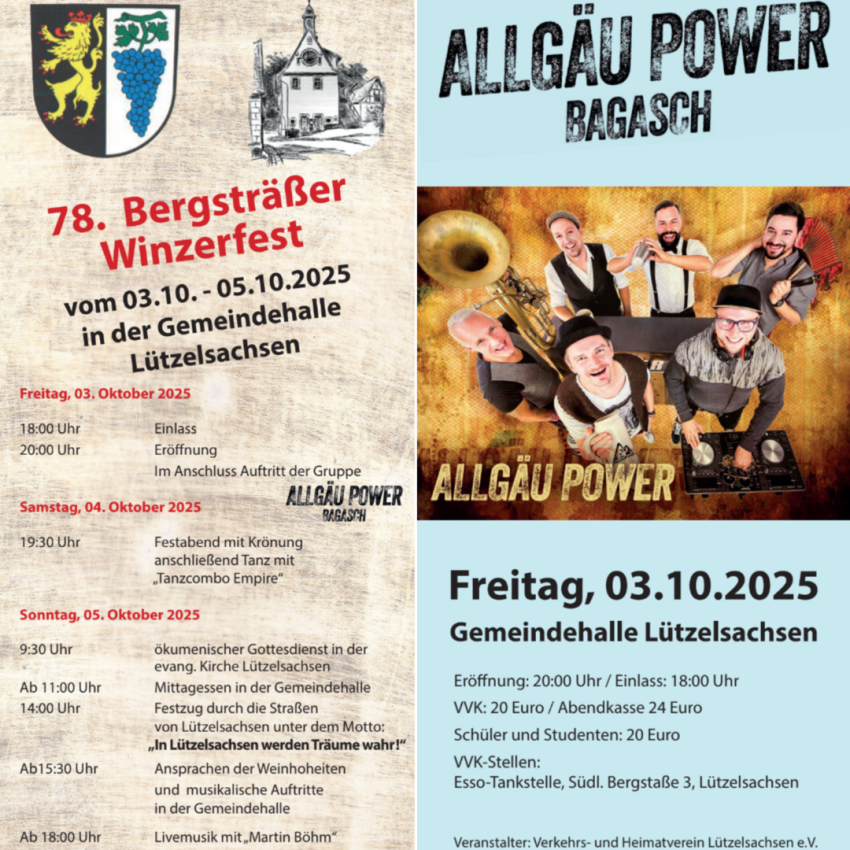 Im Mittelpunkt der Aktivitäten des Verkehrs- und Heimatvereins Lützelsachsen e.V. steht jedoch die Durchführung des Bergsträßer Winzerfestes immer am ersten Oktober-Wochenende. Durch großes Engagement und enormen Fleiß der vielen Helferinnen und Helfer ist es gelungen, dieses Fest über die Region hinaus sehr bekannt zu machen. Höhepunkte dieses Festes sind der Abend der Jugend am Freitag, die Krönungszeremonie der neuen Winzerhoheiten am Samstag und der Festzug am Sonntag.