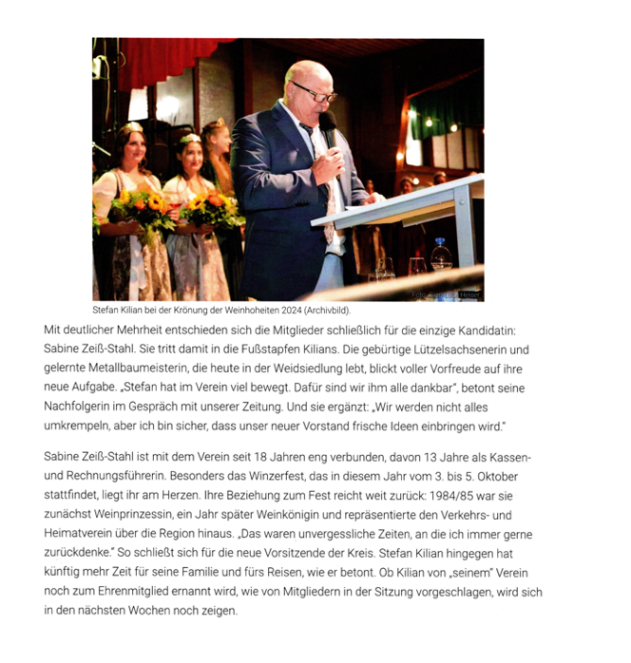 feierlich gekrönt. Der Krönungsabend ist traditionell der Höhepunkt des Winzerfestes in Lützelsachsen. Und für den Vorsitzenden des Verkehrs- und Heimatvereins, Stefan Kilian, wird er in diesem Jahr